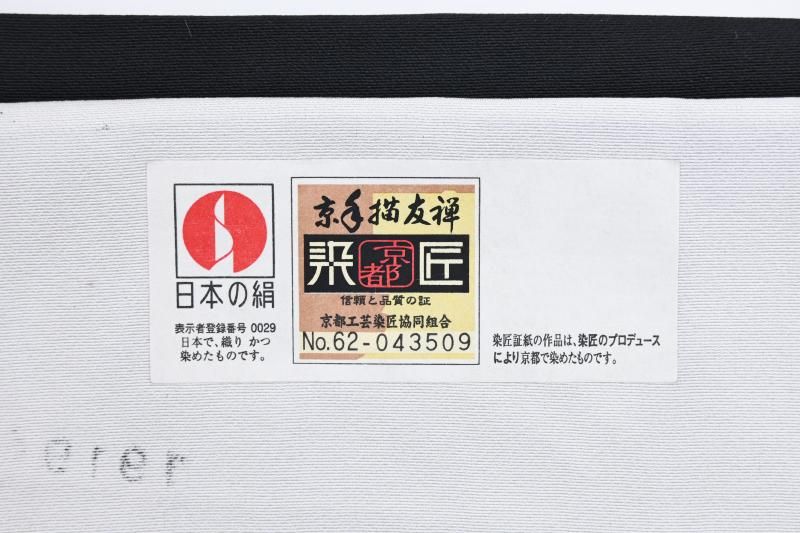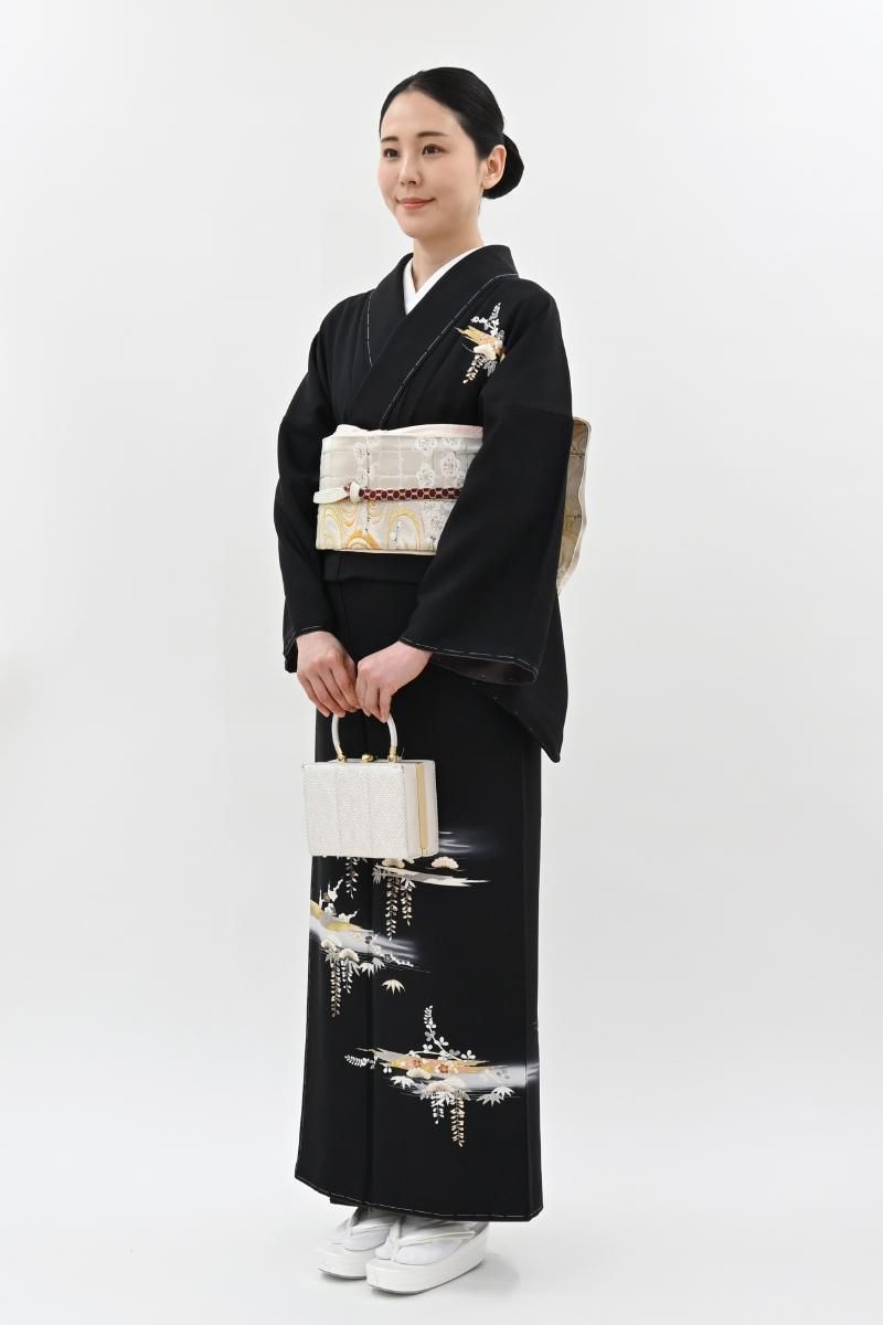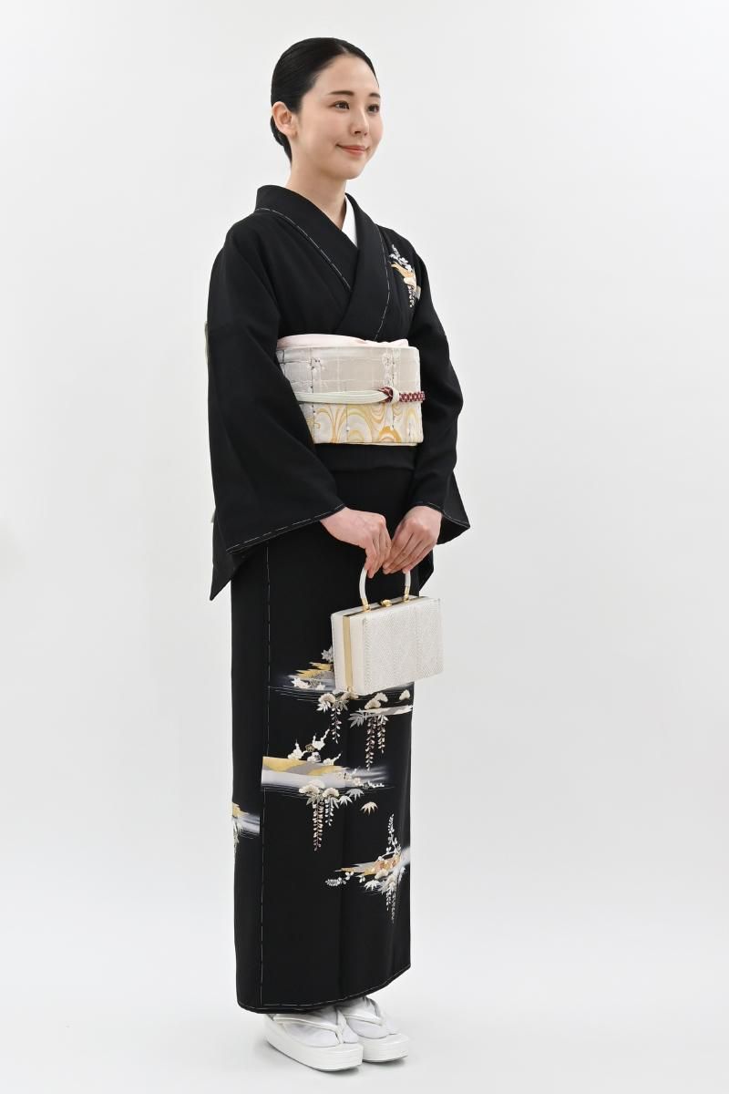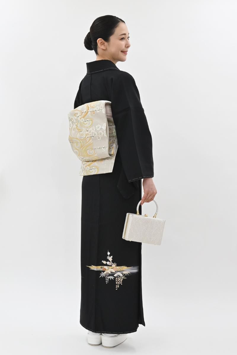 シックなお色目に、優美な彩りに金彩を添えて表現された意匠が幻想的に浮かび上がるお品、合わせる帯の雰囲気次第で控えめにも、晴れやかな趣にも、様々な装いをお楽しみ頂けることと思います。お祝いのお席やパーティなどに洗練された装いをいかがでしょうか。