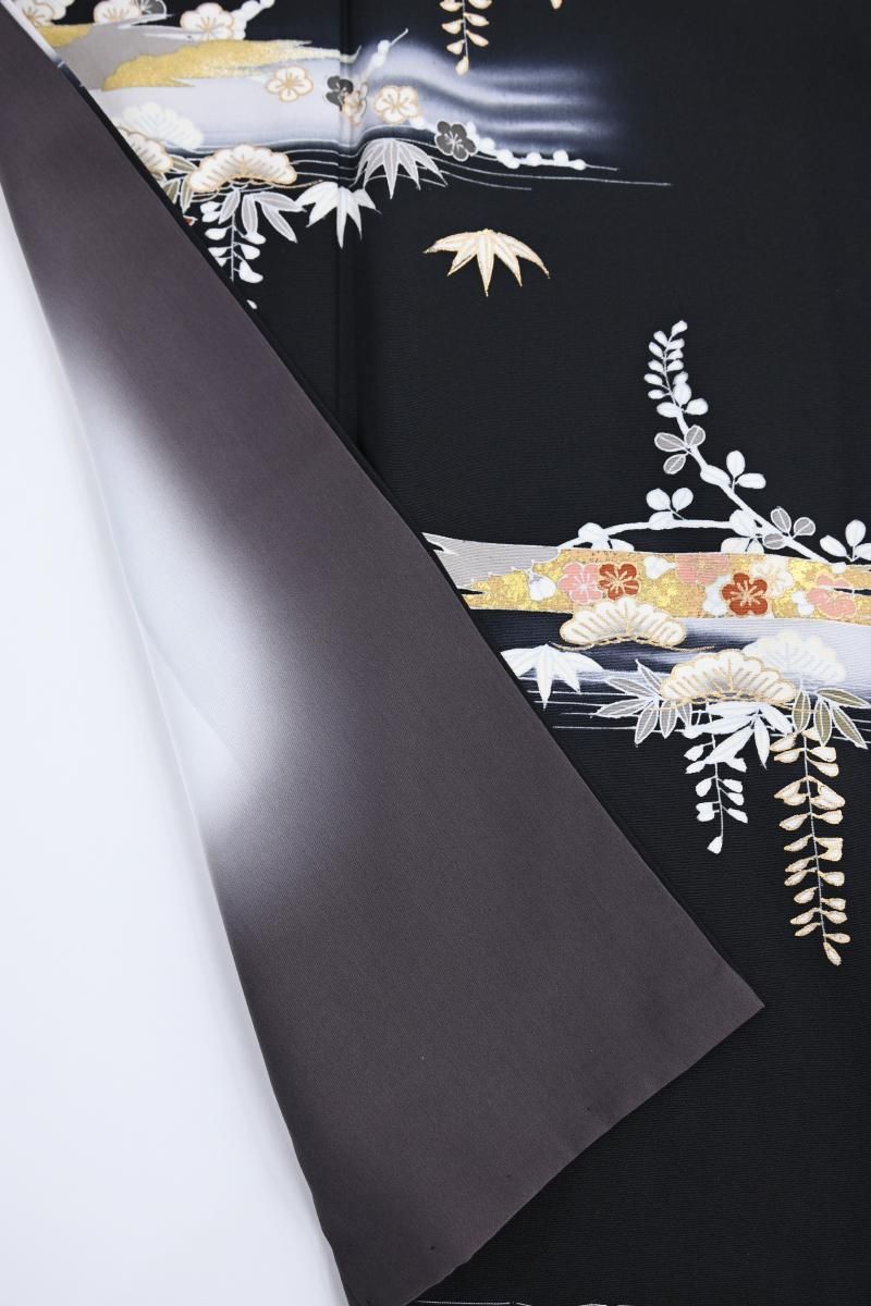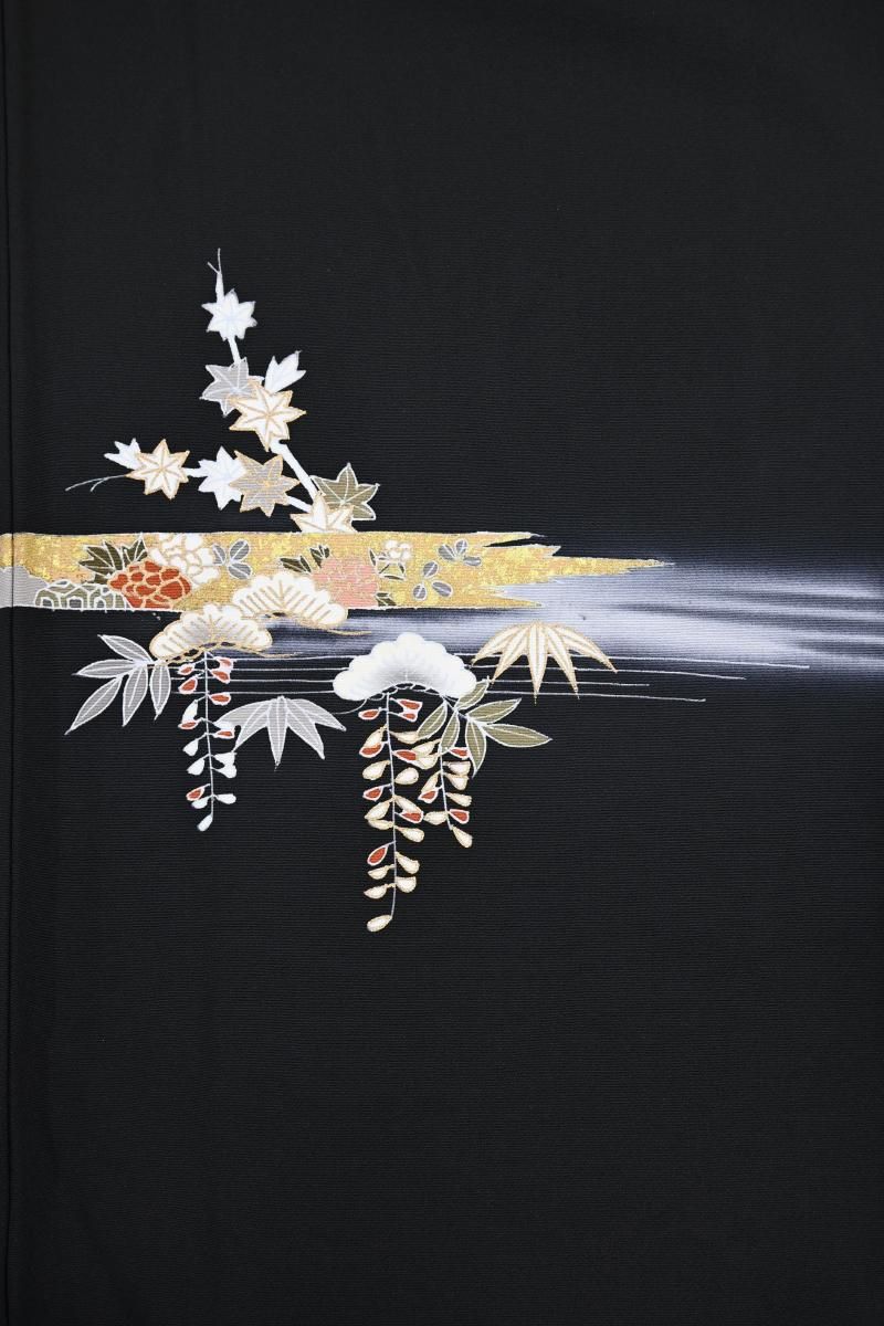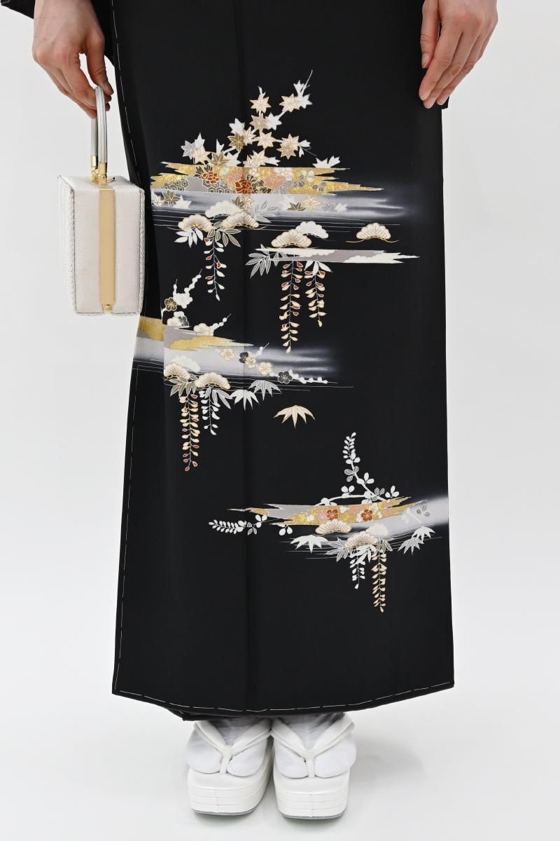 きりりとした黒色の地に、たなびく霞に重ねて楓や松、梅などの四季花を描いた付下げです。
