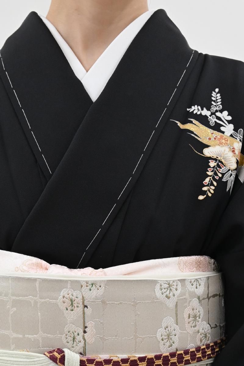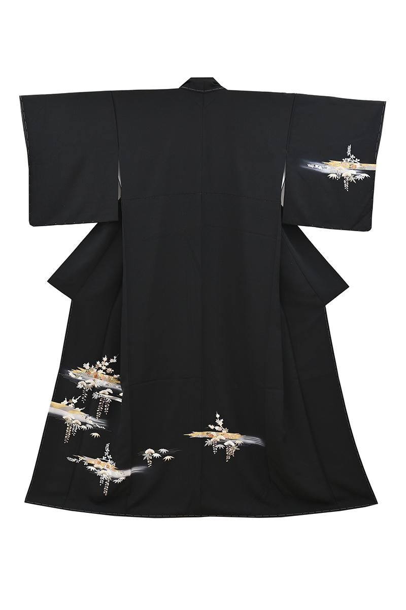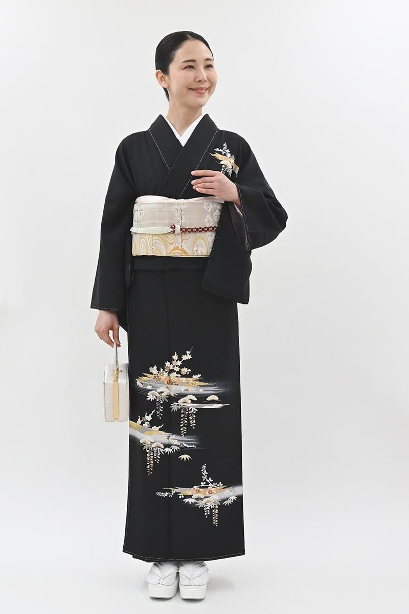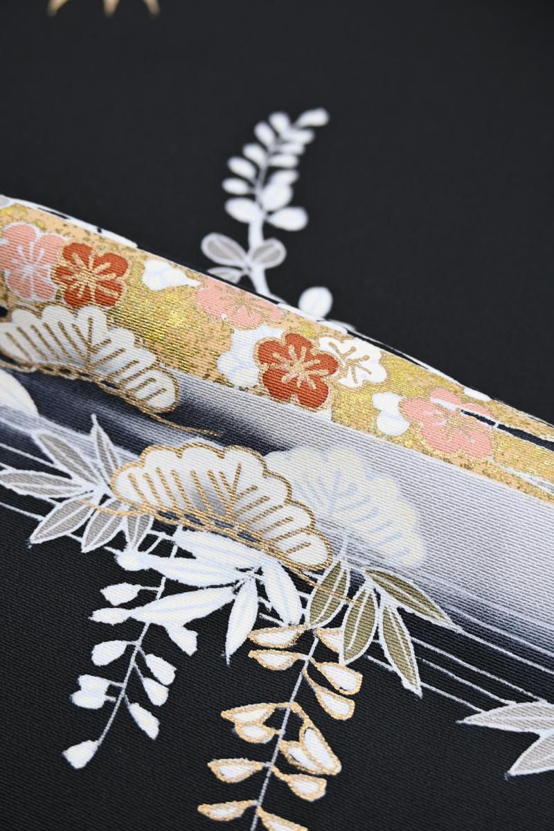 きりりとした黒色の地に、たなびく霞に重ねて楓や松、梅などの四季花を描いた付下げです。