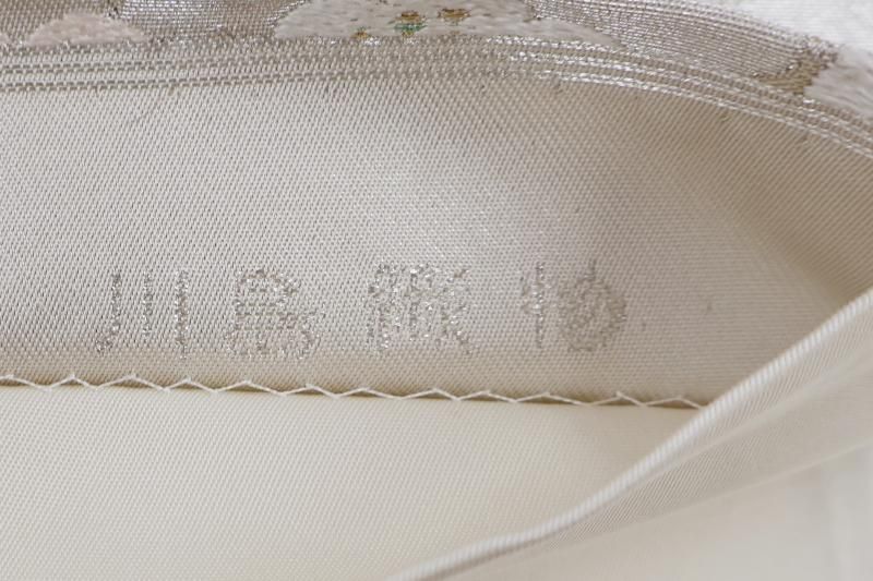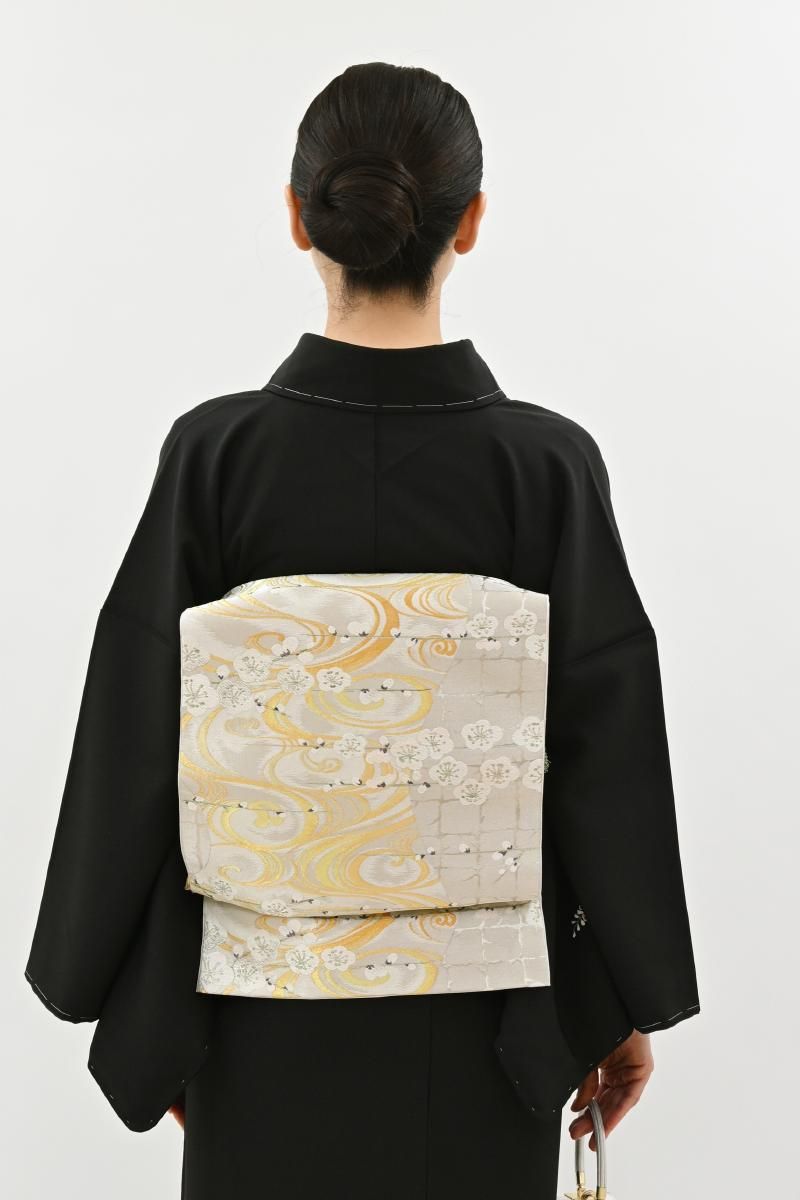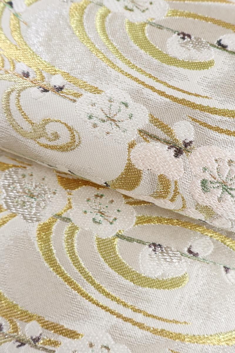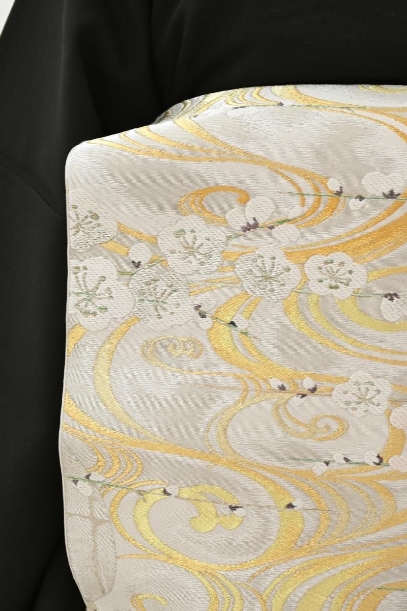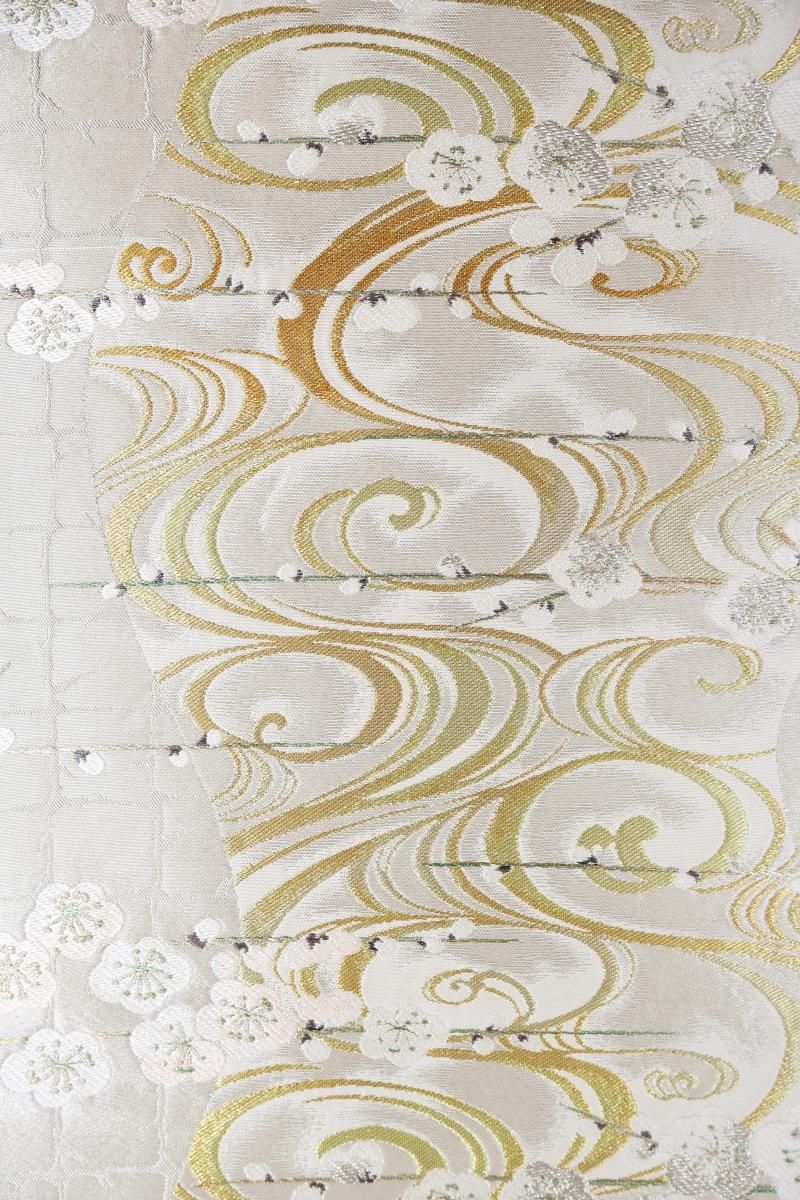 明るい銀色の地に、おおらかな流水に梅の図を織り出した本袋帯です。