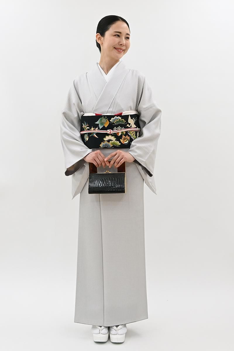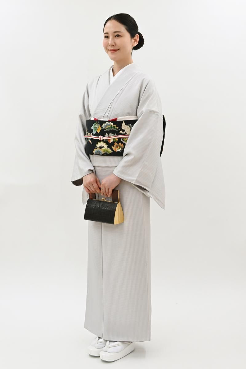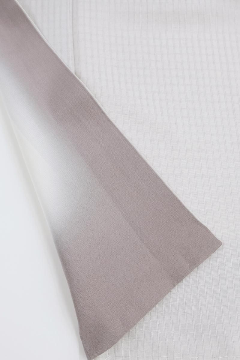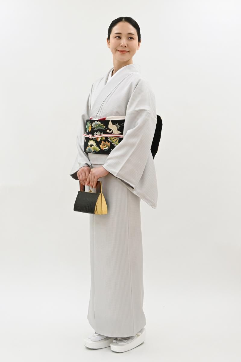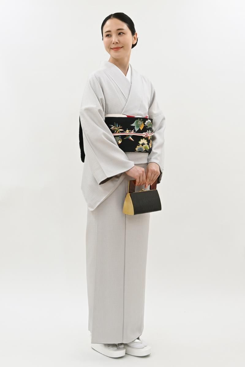 小町鼠色が近いでしょうか、わずかに紫がかったごく淡いグレーの地に、格子の地紋が浮かぶ紬です。こちらはしっとりと落ち着いたお色目に、ほのかな光沢感がほんのりとエレガントさを添えたお品、無地感覚ですので帯合わせも様々にお楽しみいただけそうですね。季節の染め帯や洒落袋帯などを合わせ、趣味性高い装いをお楽しみ下さいませ。