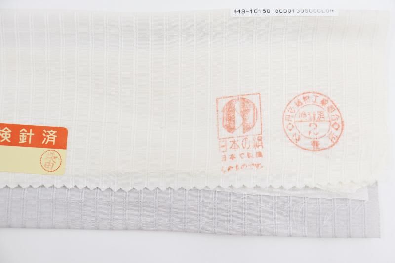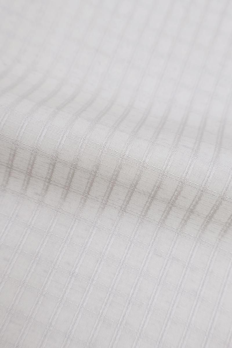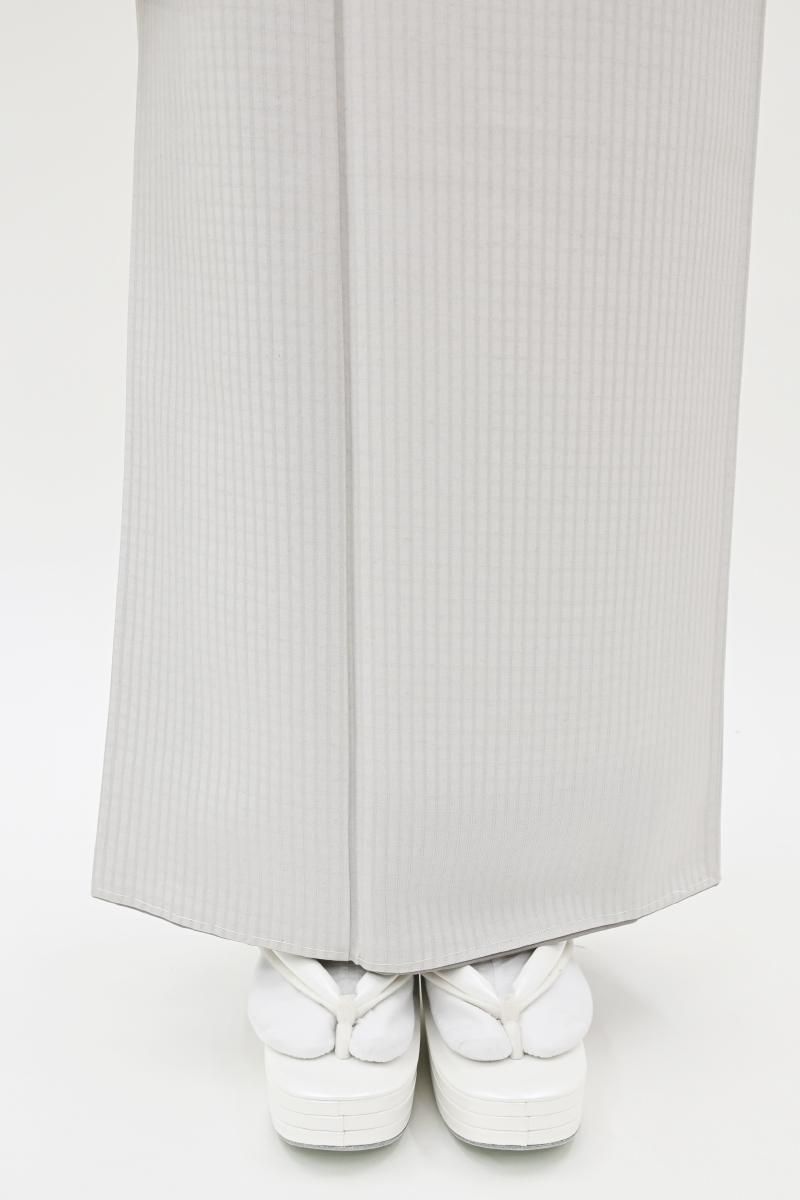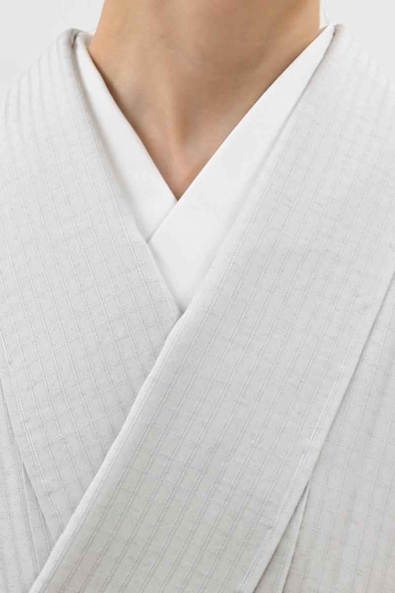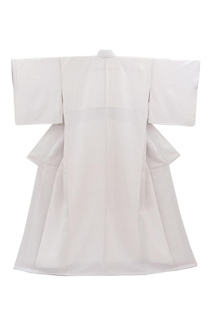 小町鼠色が近いでしょうか、わずかに紫がかったごく淡いグレーの地に、格子の地紋が浮かぶ紬です。こちらはしっとりと落ち着いたお色目に、ほのかな光沢感がほんのりとエレガントさを添えたお品、無地感覚ですので帯合わせも様々にお楽しみいただけそうですね。季節の染め帯や洒落袋帯などを合わせ、趣味性高い装いをお楽しみ下さいませ。