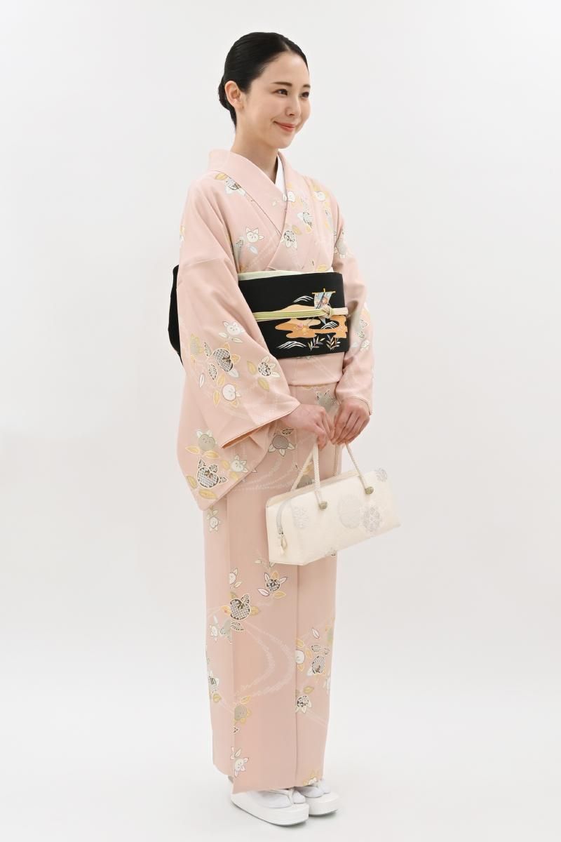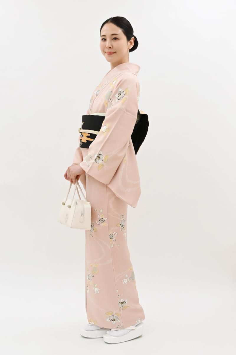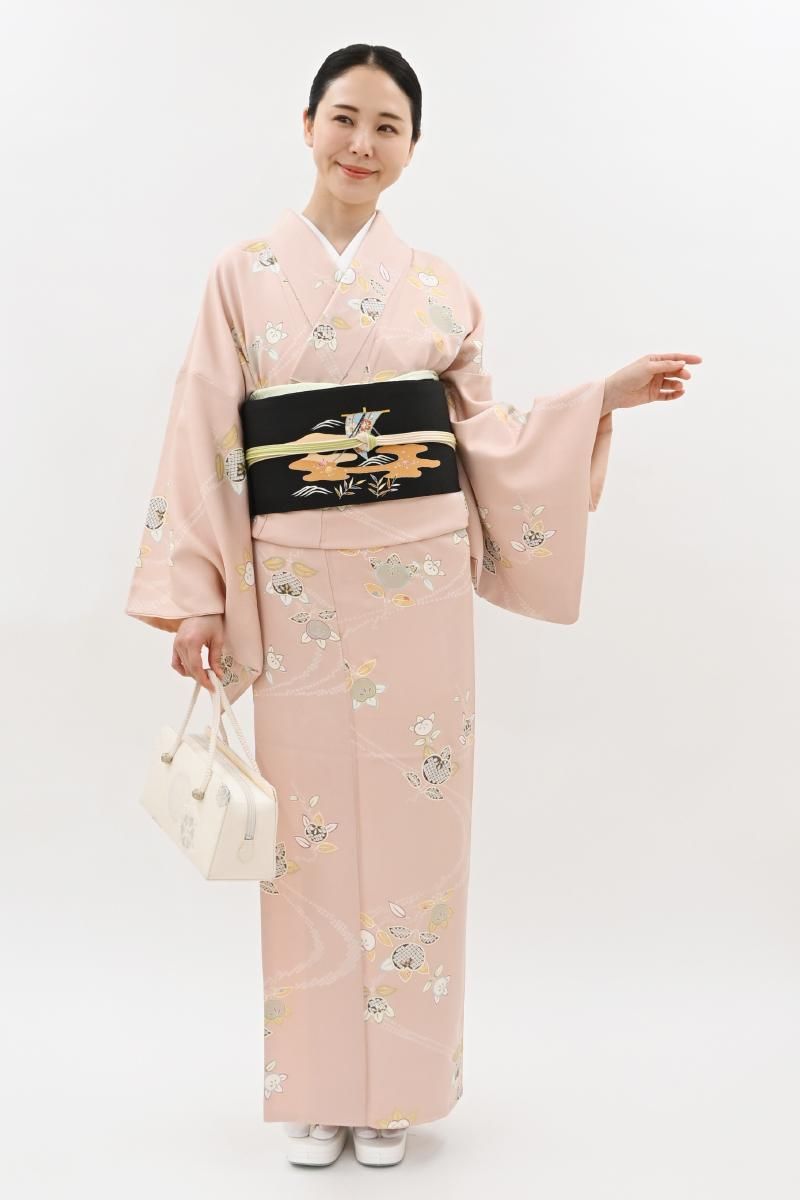 乙女色が近いでしょうか、やさしいピンク色の地に、ふっくらとした実を付けた橘の枝が配された小紋です。光の加減で毘沙門亀甲の地紋が浮かぶ女性らしいお色目に、優美な色遣いで表現されたモチーフが朗らかな印象のお品、上品な明るさが着る人を柔らかく包んでくれることと思います。新春のお出かけはもちろん、ひな祭りやひな茶会などのお席でもよく映えそうですね。どなたからも好感度の高い装いをいかがでしょうか。