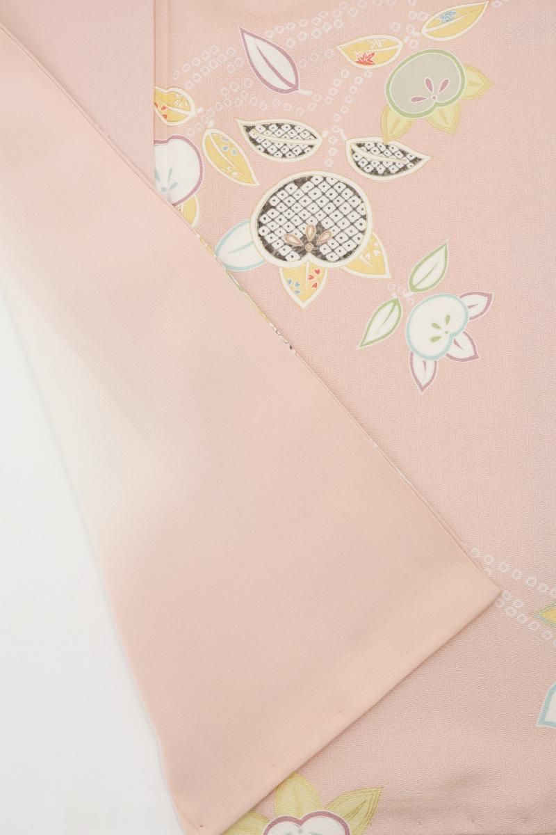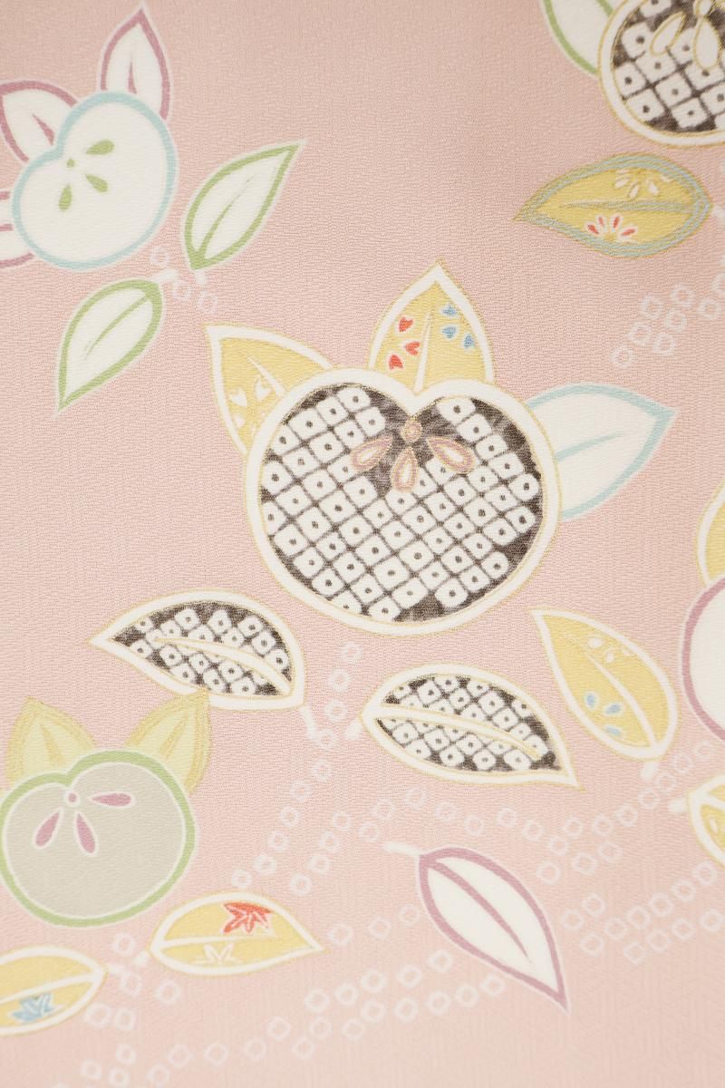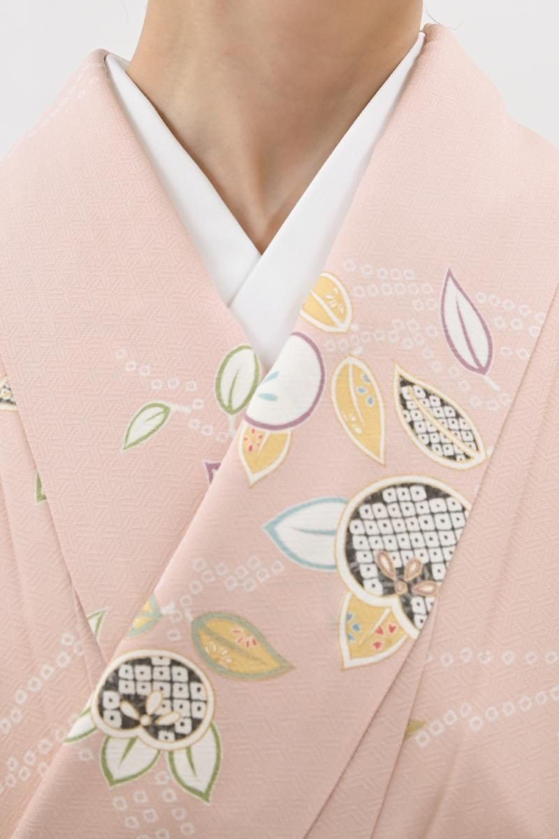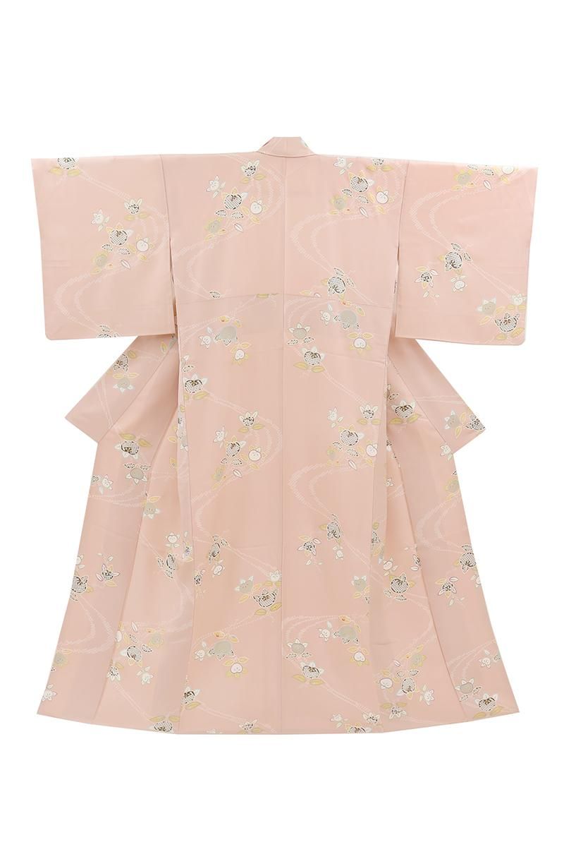 乙女色が近いでしょうか、やさしいピンク色の地に、ふっくらとした実を付けた橘の枝が配された小紋です。光の加減で毘沙門亀甲の地紋が浮かぶ女性らしいお色目に、優美な色遣いで表現されたモチーフが朗らかな印象のお品、上品な明るさが着る人を柔らかく包んでくれることと思います。新春のお出かけはもちろん、ひな祭りやひな茶会などのお席でもよく映えそうですね。どなたからも好感度の高い装いをいかがでしょうか。