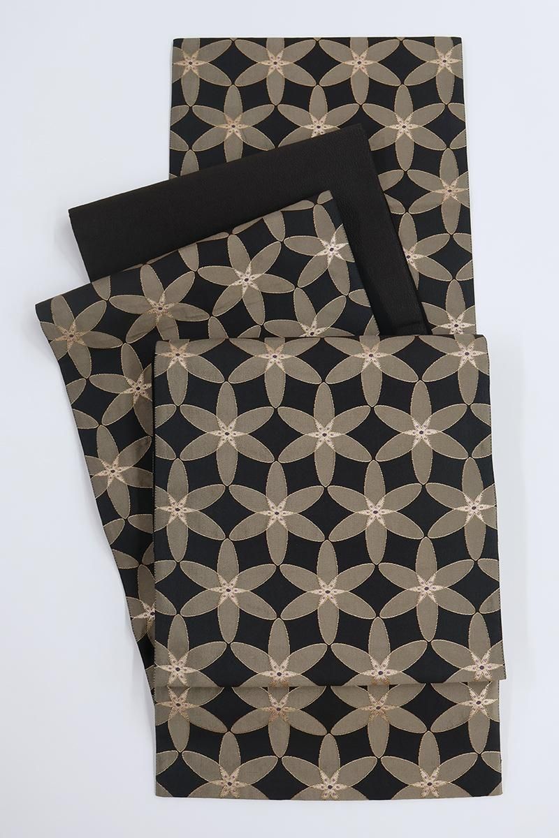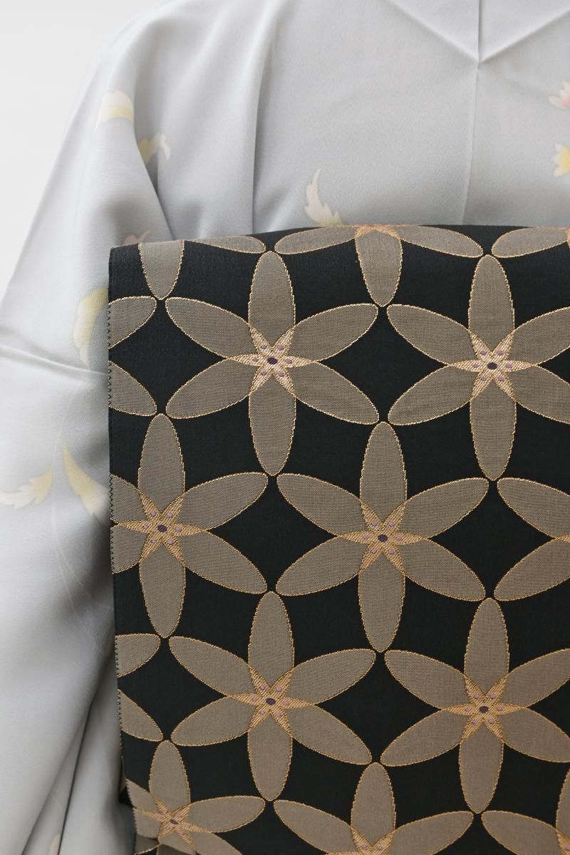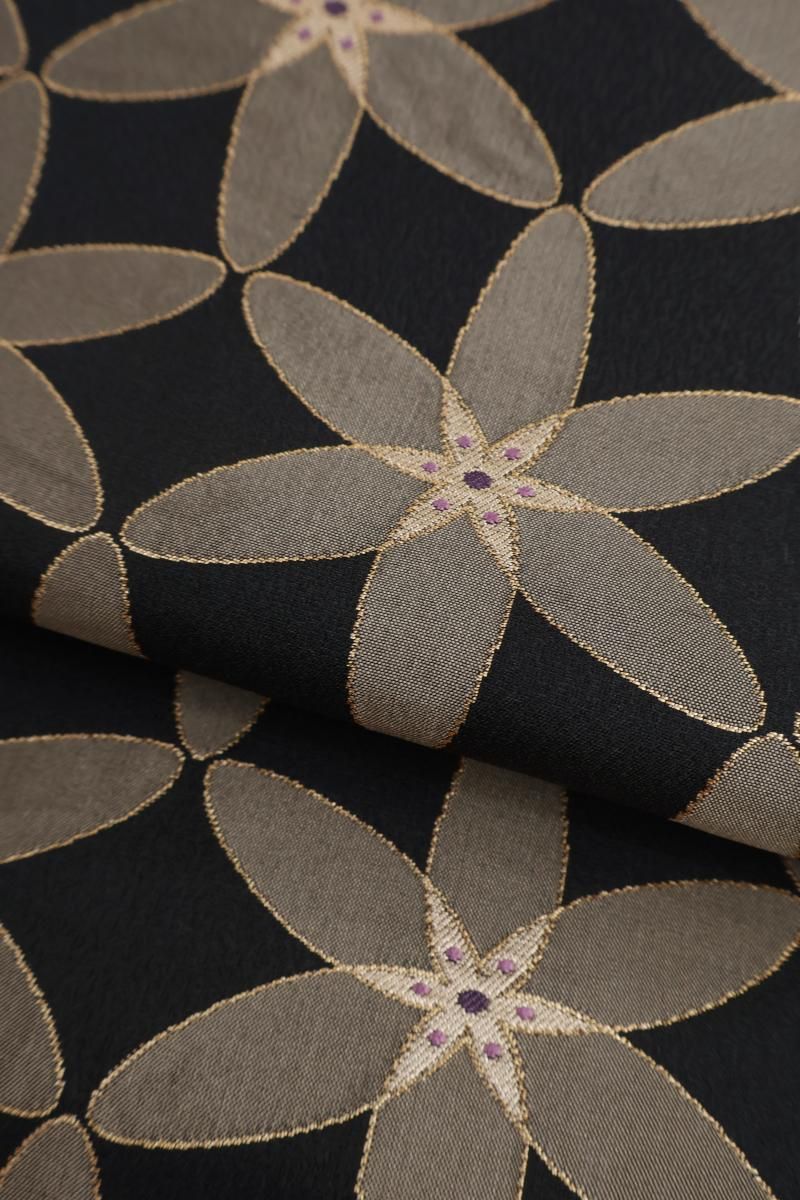 蝋色が近いでしょうか、やや色を薄めた黒色の地に、整然と並ぶ花文を織り出した袋帯です。