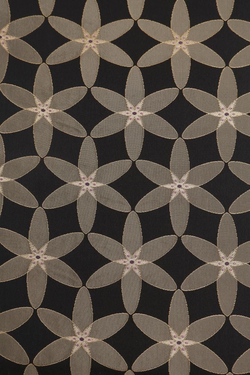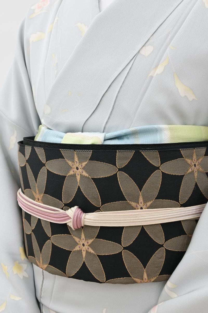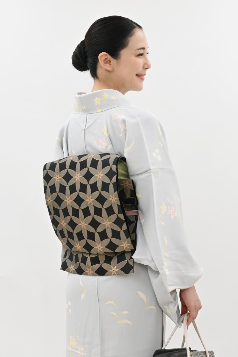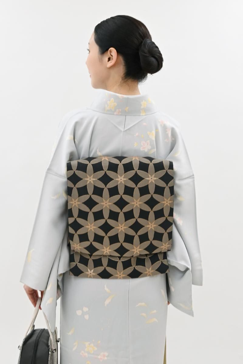 蝋色が近いでしょうか、やや色を薄めた黒色の地に、整然と並ぶ花文を織り出した袋帯です。