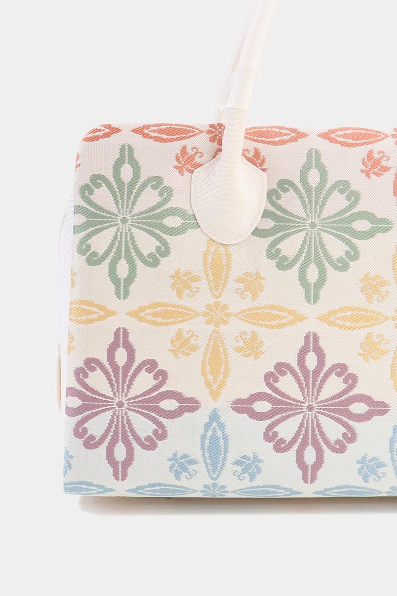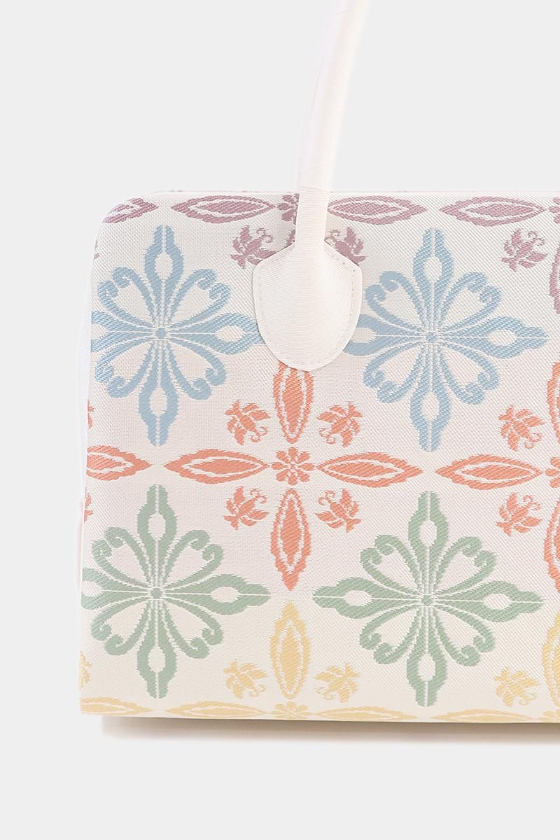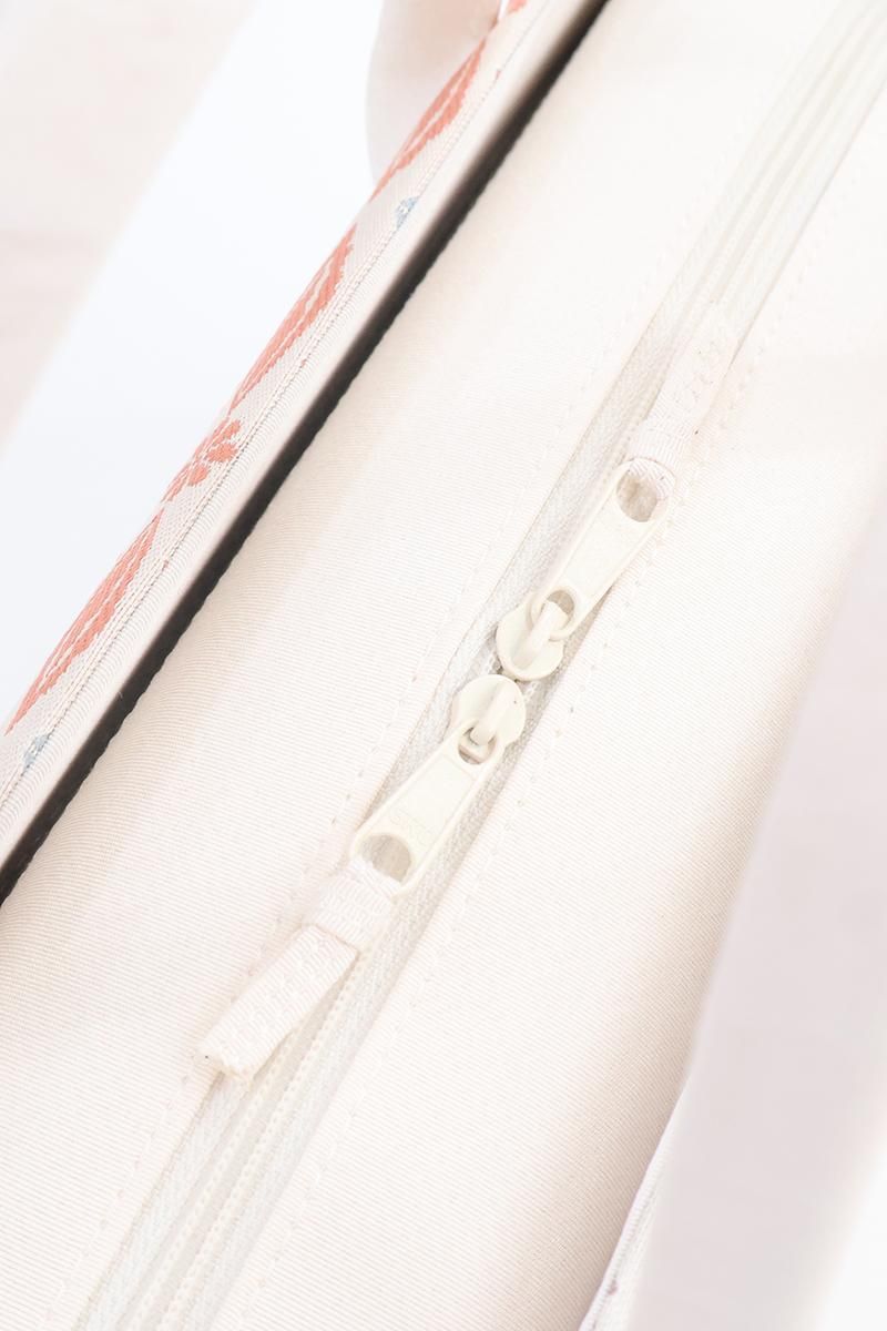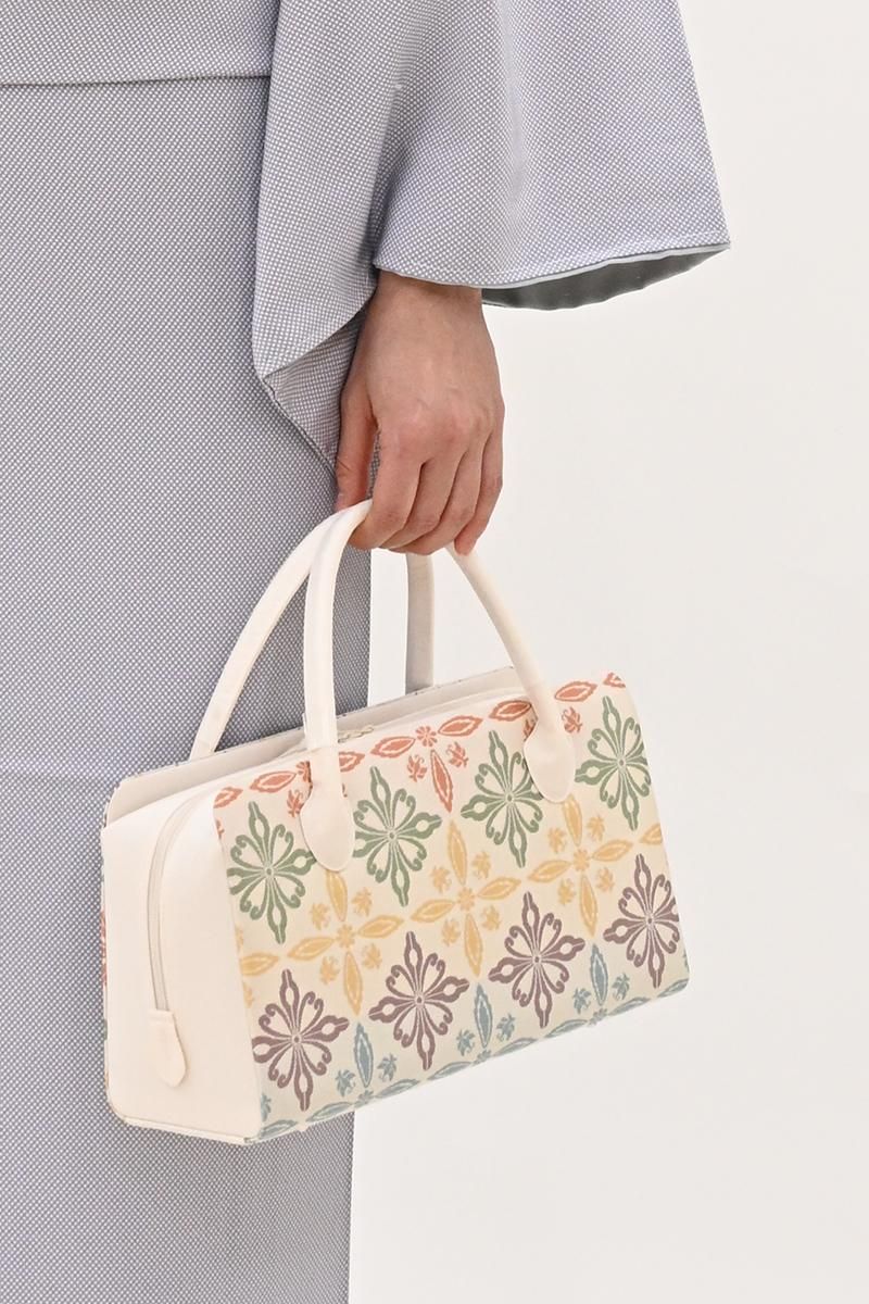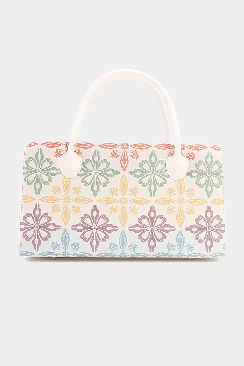 淡いベージュの地に優しいお色味で装飾的な文様が散りばめられた利休バッグです。